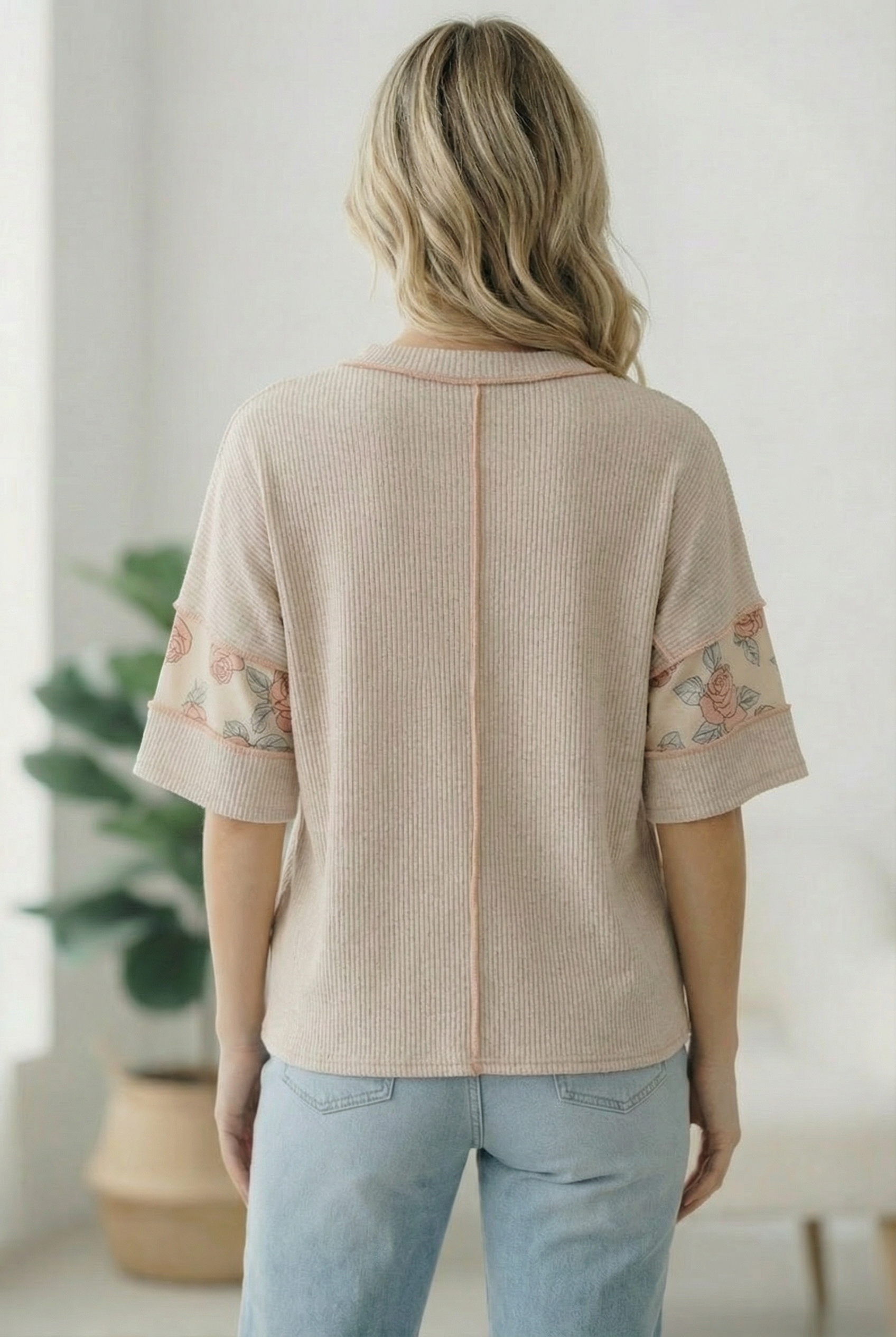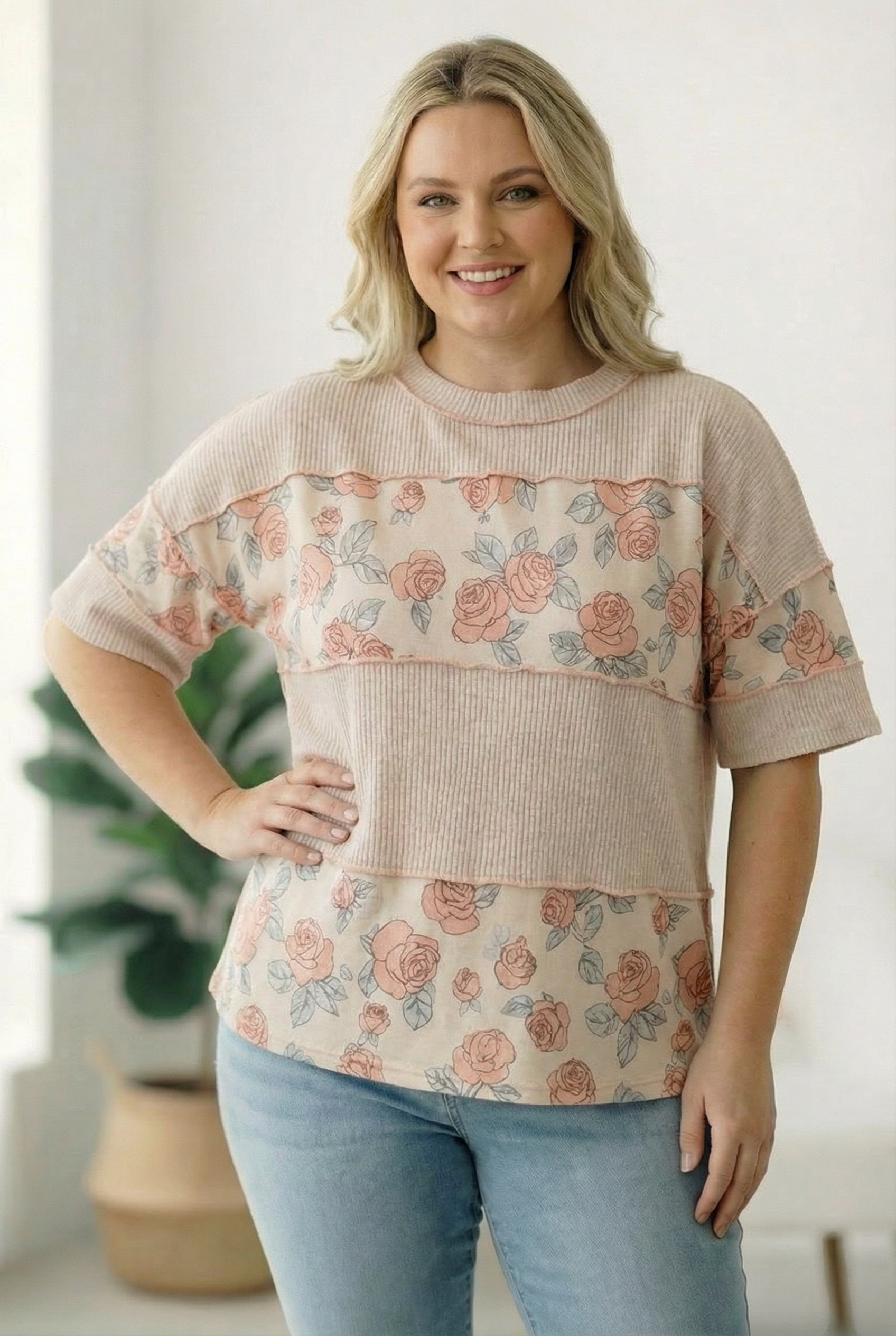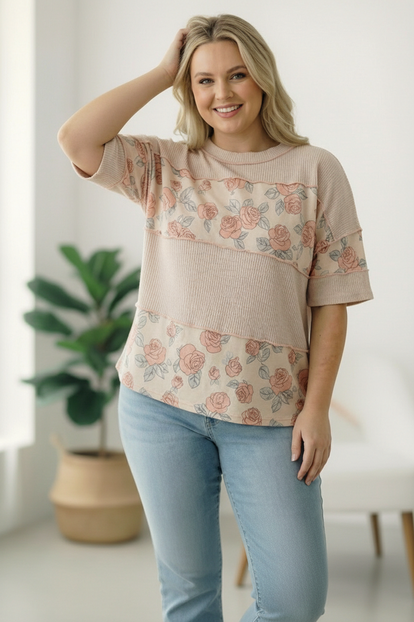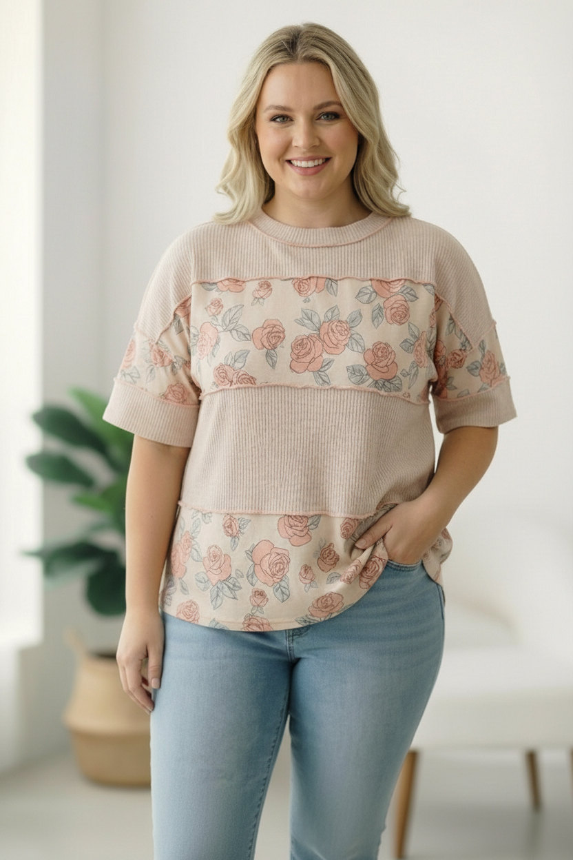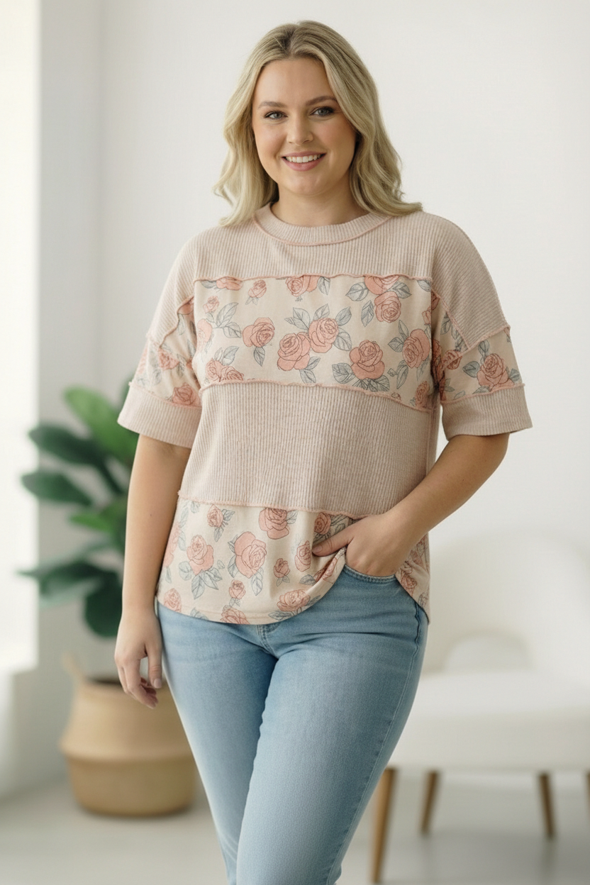 A perfect blend of comfort and feminine charm, this knit top brings an easy boutique feel to everyday style. Designed with a classic round neckline and relaxed short sleeves, it features a soft rib knit body paired with floral print panels for a stylish color block look. The exposed outseam overlock detailing adds a modern, casual touch, giving the top a laid back yet elevated finish. Easy to pair with denim or shorts, this lightweight knit top is a comfortable, go to piece for casual outings, weekend plans, and everyday wear.