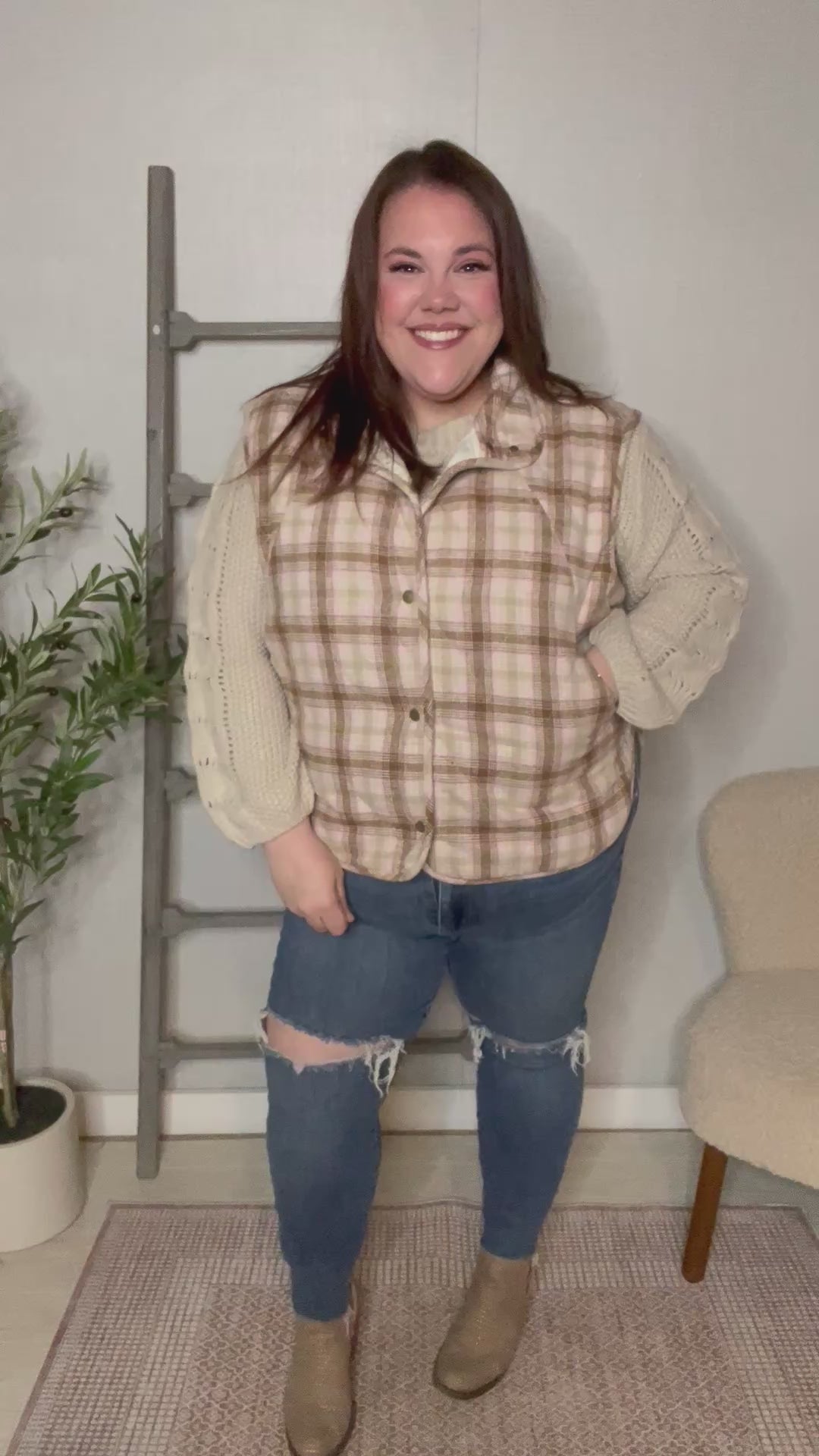 Stay warm in style with this cozy plaid quilted vest from Haptics. Designed with a soft woven plaid exterior and fully lined for comfort, this sleeveless puffer vest features a high neckline, functional snap-button front, and convenient side pockets. The taupe and caramel tones add a rustic-chic touch that pairs effortlessly with denim, flannels, or lightweight sweaters for the perfect fall layering piece.