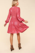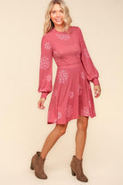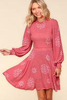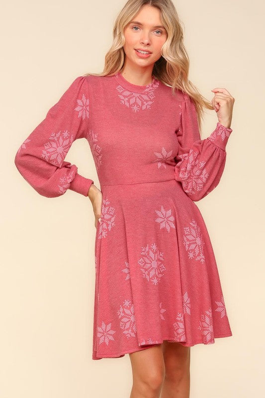 Embrace cozy holiday charm with this darling vintage-inspired dress from Haptics. Featuring a soft brushed hacci knit fabric in a warm red hue, this piece blends comfort and classic style effortlessly. The mock neckline and puff long sleeves add an elegant touch, while the fit-and-flare silhouette creates a flattering, feminine shape. Adorned with a delicate snowflake print, it’s the perfect dress for winter festivities, holiday photos, or a cozy night out.
