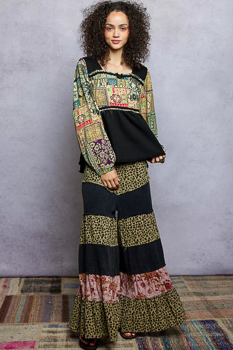 The balloon sleeves add volume and a touch of drama, while delicate trim details enhance the neckline and seams for a feminine, polished look. The contrast thermal and printed patchwork fabric creates texture and visual depth, giving this piece a one-of-a-kind feel. Cozy yet chic, this blouse transitions perfectly from day to night.