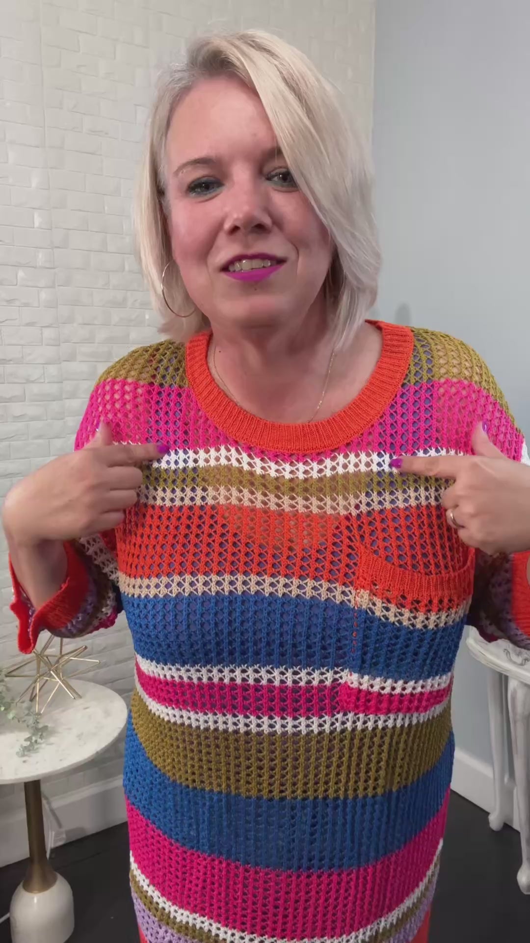 Get lost in deep musings while staying stylish in our Deep Thoughts Striped Loose Knit Top! This playful top features a mesh knit design, ribbed details on the rounded neckline, drop shoulder for a relaxed fit, and ribbed sleeve cuffs and hemline. Side slits and a functional patch pocket add a touch of fun.