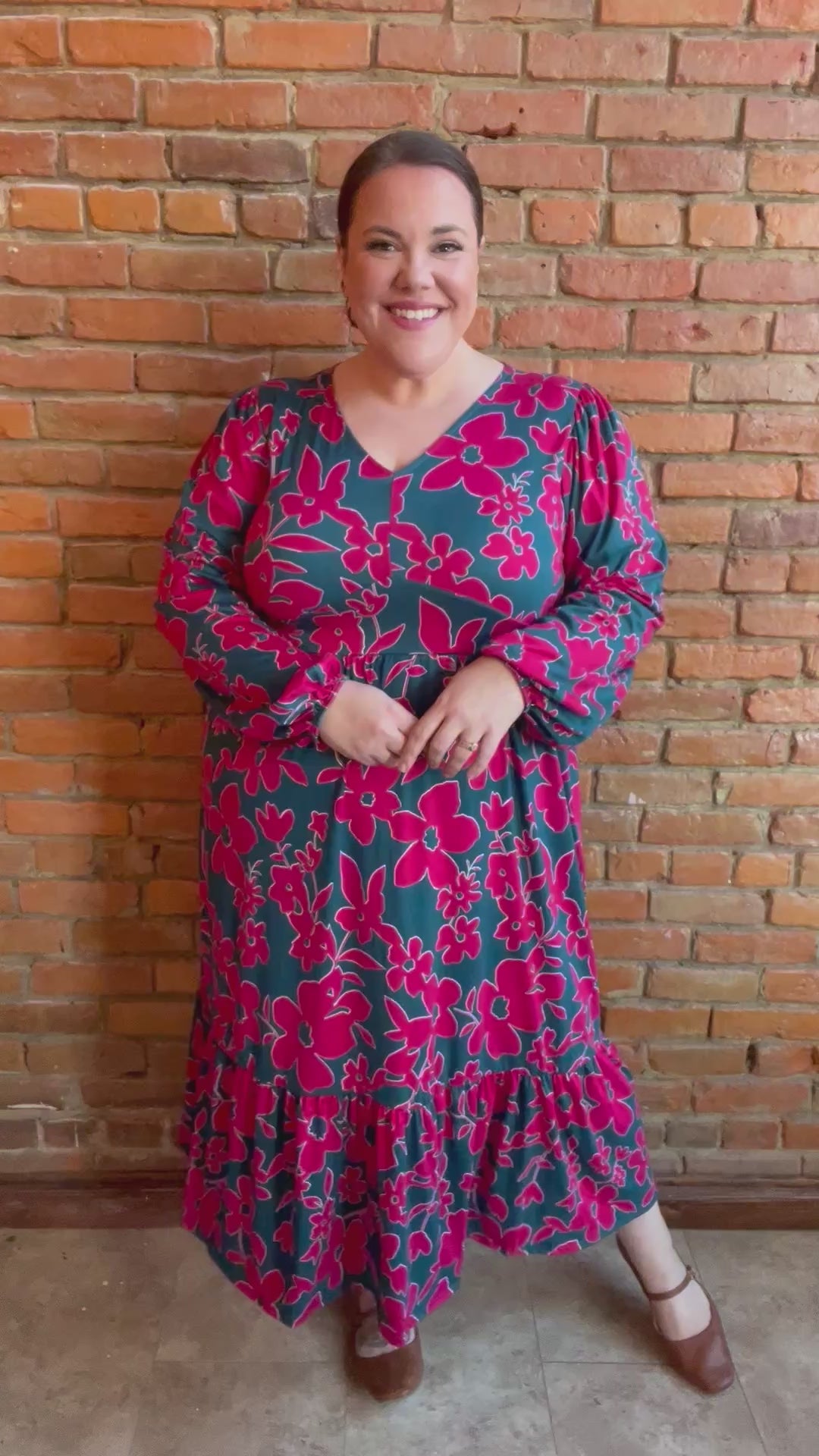 Haptics Teal & Magenta Vintage Floral Midi Ruffle Hem Dress