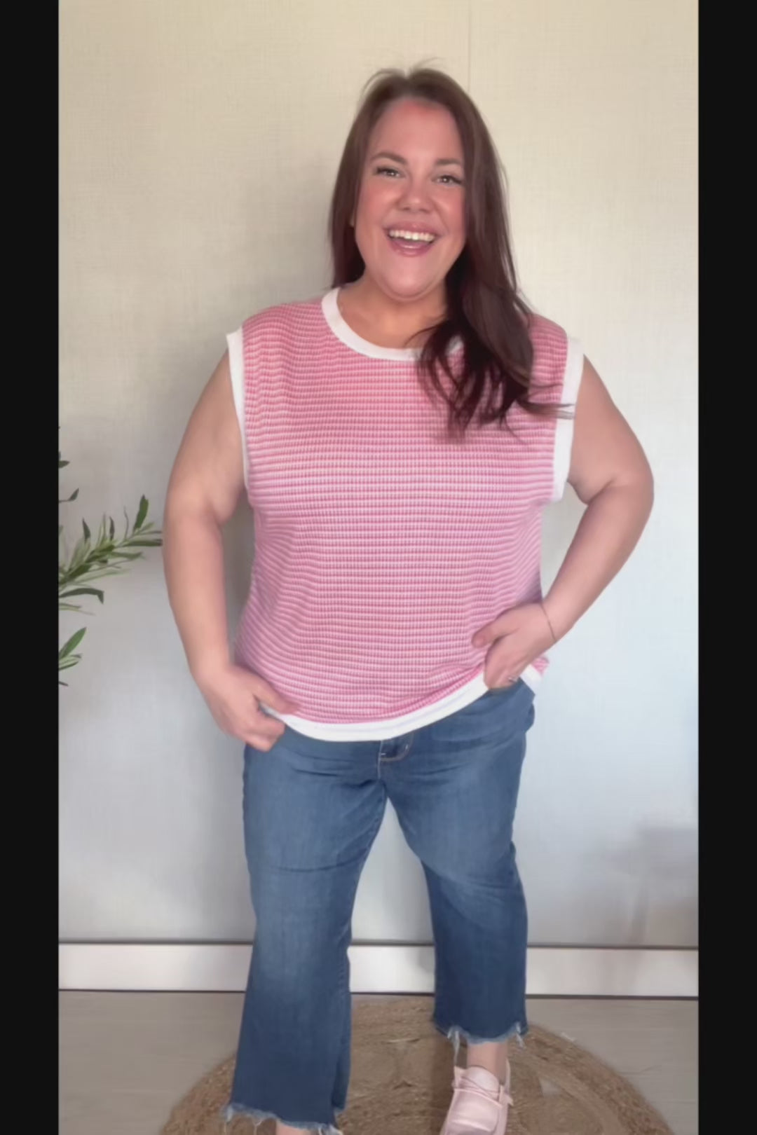 Experience the ultimate style with our Haptics Pink & Ivory Jacquard Waffle Knit Banded Sleeveless Top. This iconic piece features a trendy two-tone design and banded sleeves and hemline, perfect for pairing with any denim. Get ready to turn heads and rock a youthful look!
