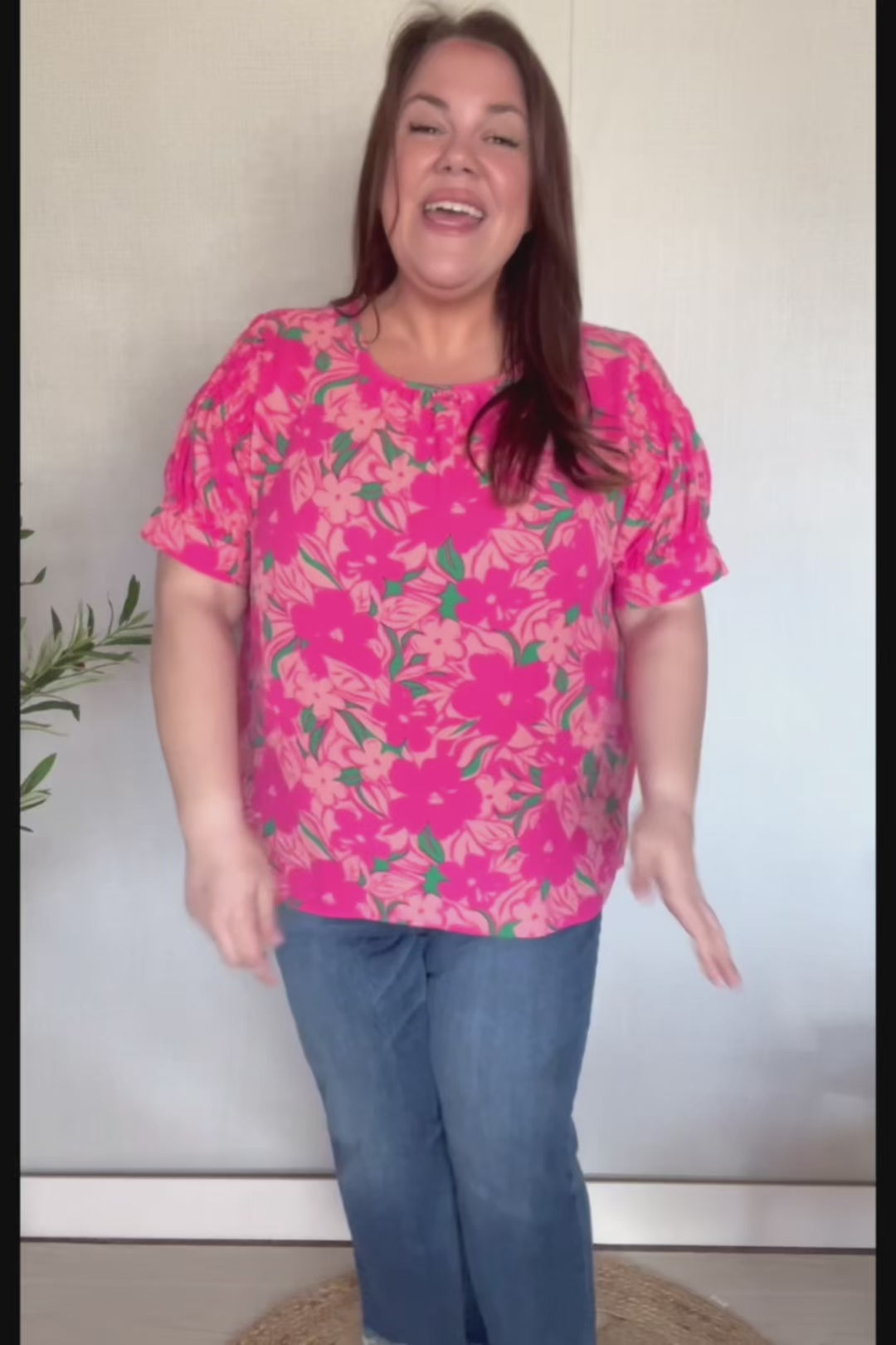 Haptics Floral Back Keyhole Short Smocked Banded Sleeve Top